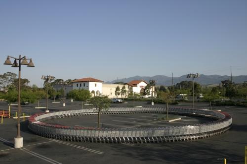 That looks to be the better part of 500 trolleys and a diameter of about 10 car-space-widths. The Coles I worked at once had 450 trolleys but never enough flat space. So, that would be a no.